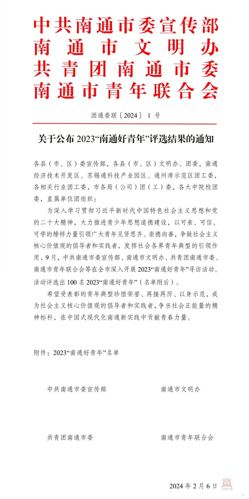 为深入学习贯彻习近平新时代中国特色社会主义思想和党的二十大精神,大力推进青少年思想道德建设,中共南通市委宣传部、南通市文明办、共青团南通市委、南通市青年联合会等联合开展2023“南通好青年”寻访活动。旨在以可亲、可信、可学的榜样力量引领广大青年见贤思齐、崇德向善,争做社会主义核心价值观的倡导者和实践者,发挥社会各界青年典型的引领作用。