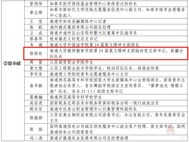经过组织推荐、个人自荐、专家评审等环节,近日,2023“南通好青年”评选结果公布。共评选出 100 名 2023“南通好青年”,公司23级地理教育专业研究生徐雨辰获评“崇德奉献好青年”。