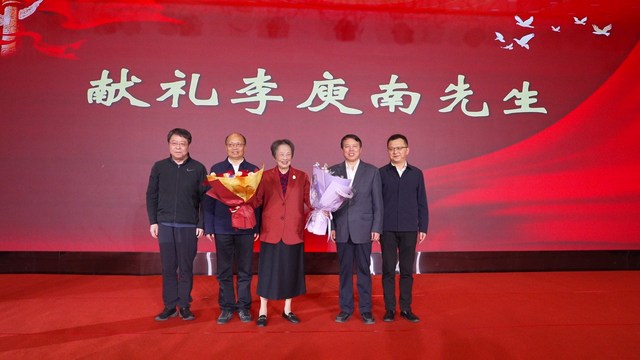 杨宇民、陆岳新分别向李庾南先生献礼,张卫星、陈斌上台一起合影留念。