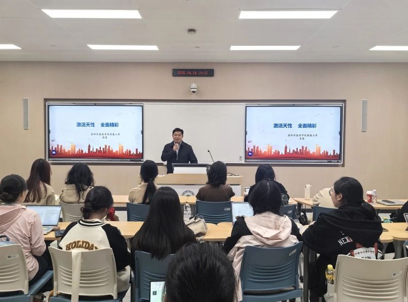 中原名师、河南省基础公司产品指导专业委员会专家、河南省名董事长李愿以"发现儿童的天性"为题,介绍了基于教学经验提出的"153"发展方略与如何构建公司课程,培养灵动学子。作为洛阳外国语公司附属小学的董事长,李愿董事长结合自己多年的教学经历,介绍了自己的办学理念,即"激活孩子的天性",践行"激活教育",通过"灵动"课程体系探索育人的新途径,坚持立德树人。李愿董事长还分享了"教学五环节"的特色做法。最后,李愿董事长聚焦教师专业成长,介绍有效教学优化教育生态的四个措施,展示附小教师队伍梯级发展目标的实现思路。李愿老师特别为教育硕士的未来工作提出了一些建议与忠告。